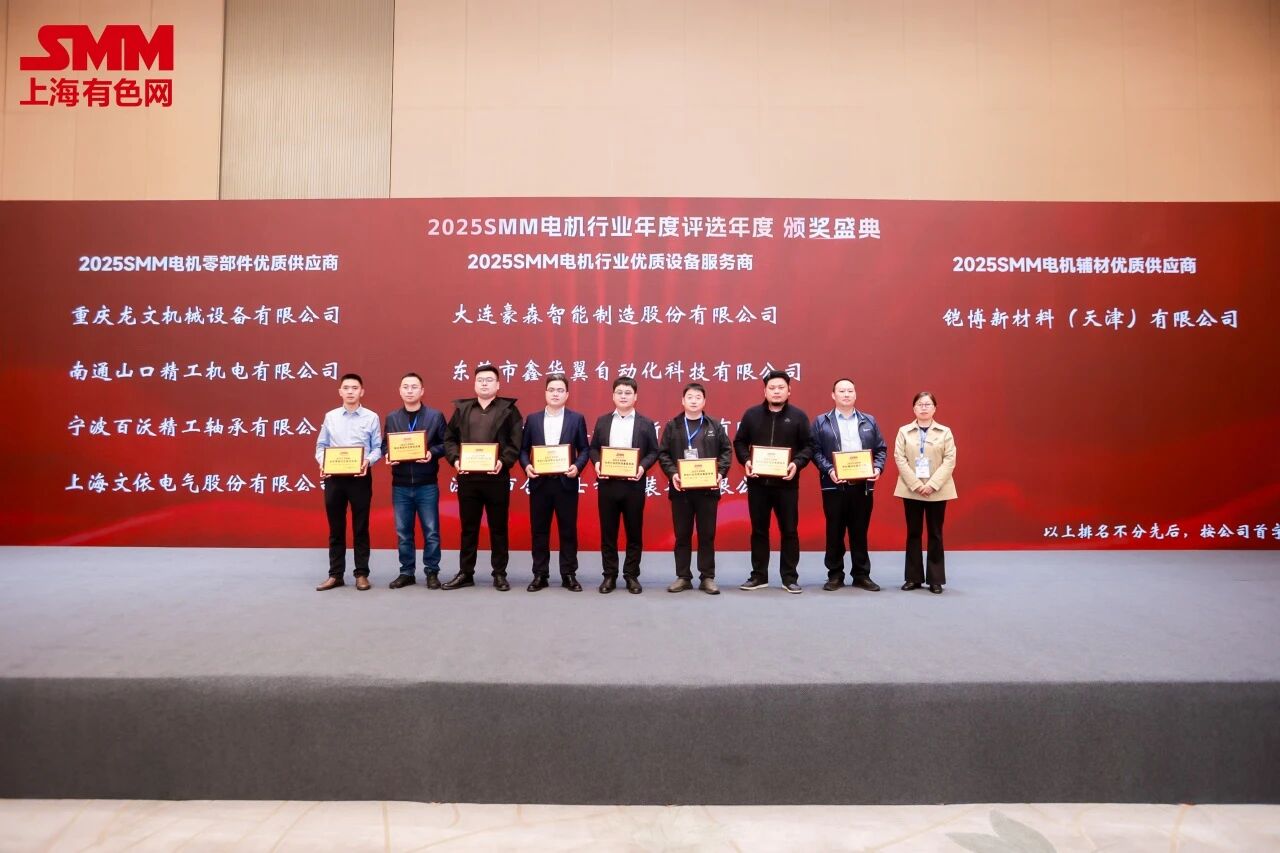 2025年11月12-14日,在由上海有色网信息科技股份有限公司(SMM)主办,宁波招宝磁业股份有限公司总冠名的SMM 2025IEMC(第五届)电机年会暨产业链博览会在浙江·宁波国际会议中心举行。期间,举办了优质供应商颁奖仪式,文依电气获评“2025SMM电机零部件优质供应商”。